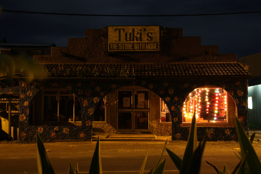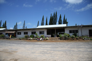 Hlavní třída největší vesnice na Aitutaki, Arutanga. V poměrně velké budově na obrázku sídlí správa přístavu, celá místní vláda, obchod, a kadeřnictví. |
