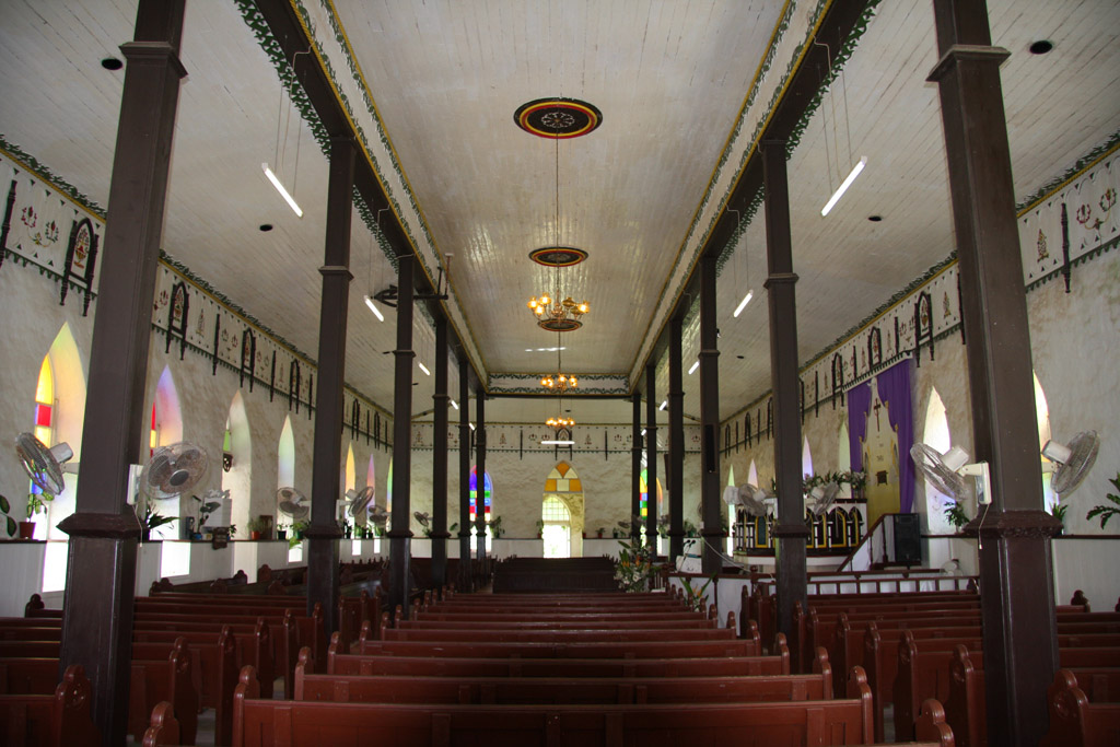 Vnitřek největšího kostela na Aitutaki. Postaven v roce 1828 je nejstarší na Ostrovech. |