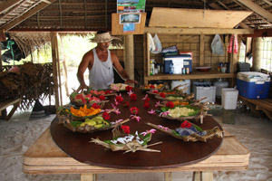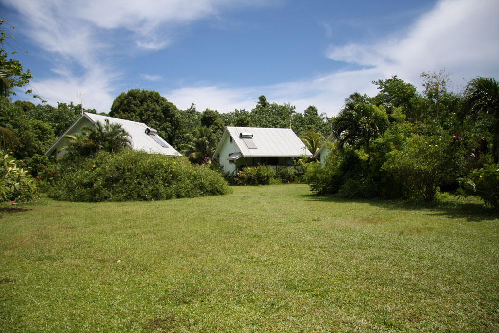Tady jsem na Aitutaki bydlel. Tři chaty (na obrázku jsou vidět jen dvě, poslední je vlevo) v nádherné tropické zahradě patří královně ostrova jménem Gina. Velmi milá a noblesní dáma mě přišla na letiště vyzvednout osobně, ale pak už se o mě starala Sally, jejich vzdálená příbuzná a správcová. |