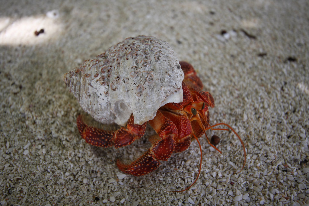Rak poustevníček. Větší kousek. Těchto raků je na Ostrovech tolik, že když vydržíte na pláži sedět chvíli nehybně, zjistíte, že praktický každá mušle, škeble a aspoň trochu děravý kámen někam běží... |